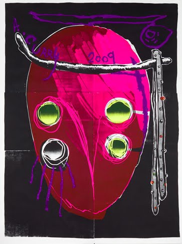 Aaron Curry Mixelplitz-Masked Mug, 2009, unique silkscreen and gouache on paper, 113 x 85 inches (287 x 215.9 cm)